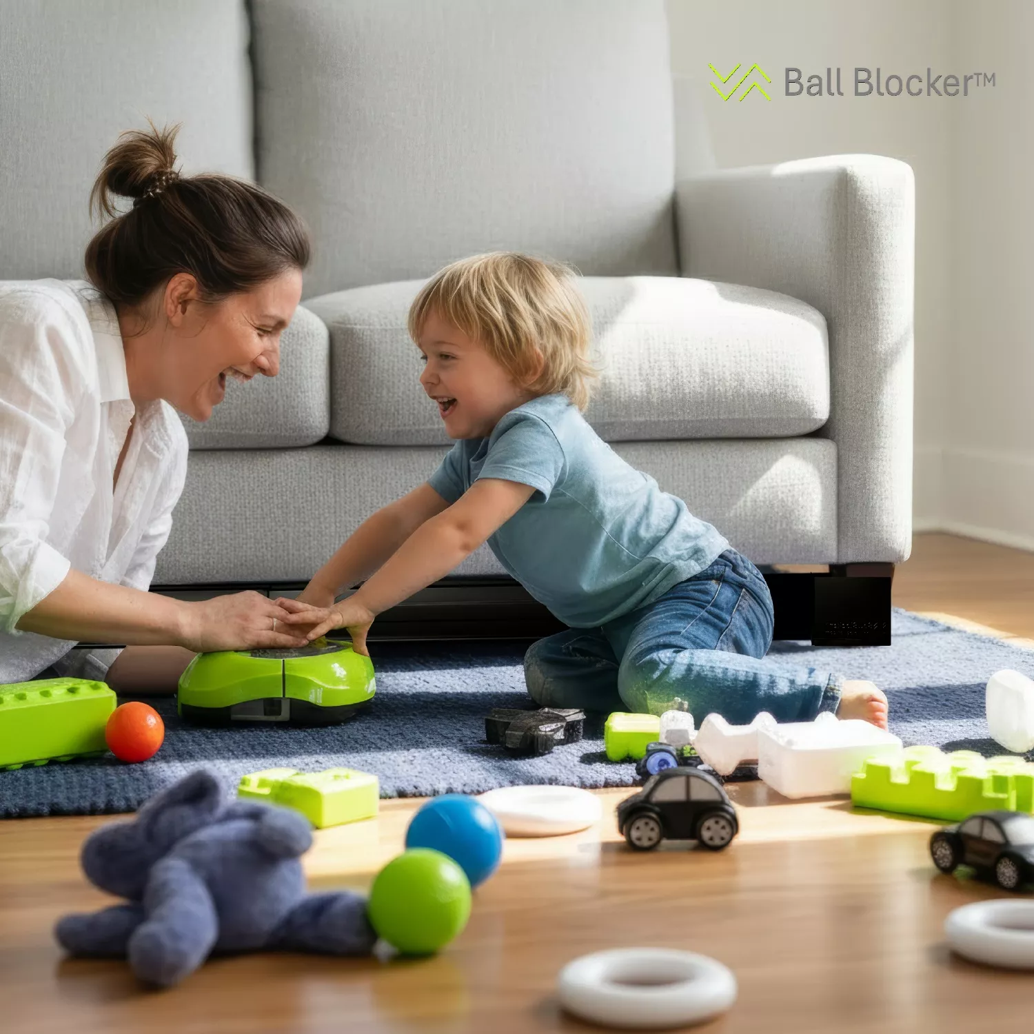 Ball Blocker is an adjustable, durable solution that stops balls and toys by blocking the gap under furniture with a sturdy plastic barrier.