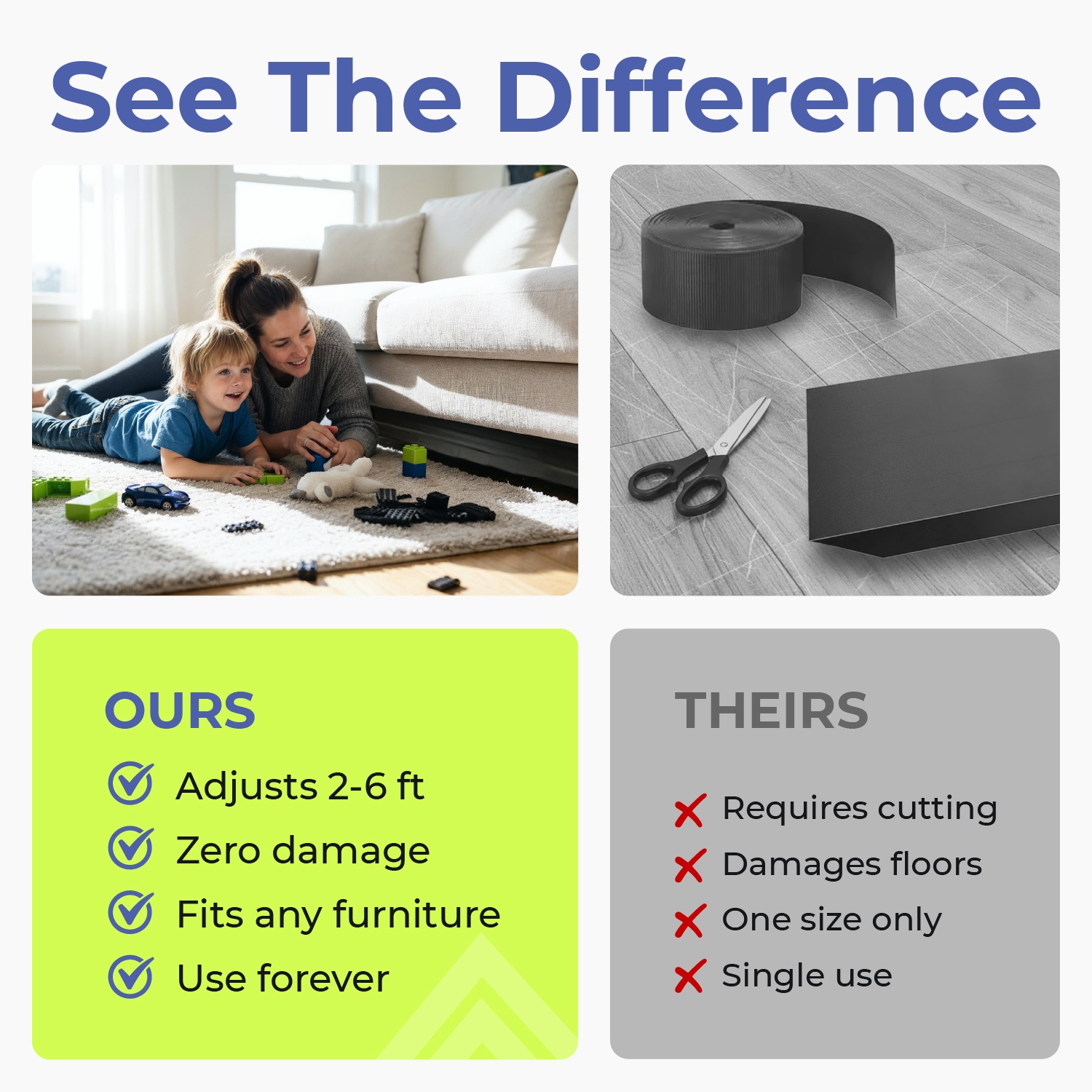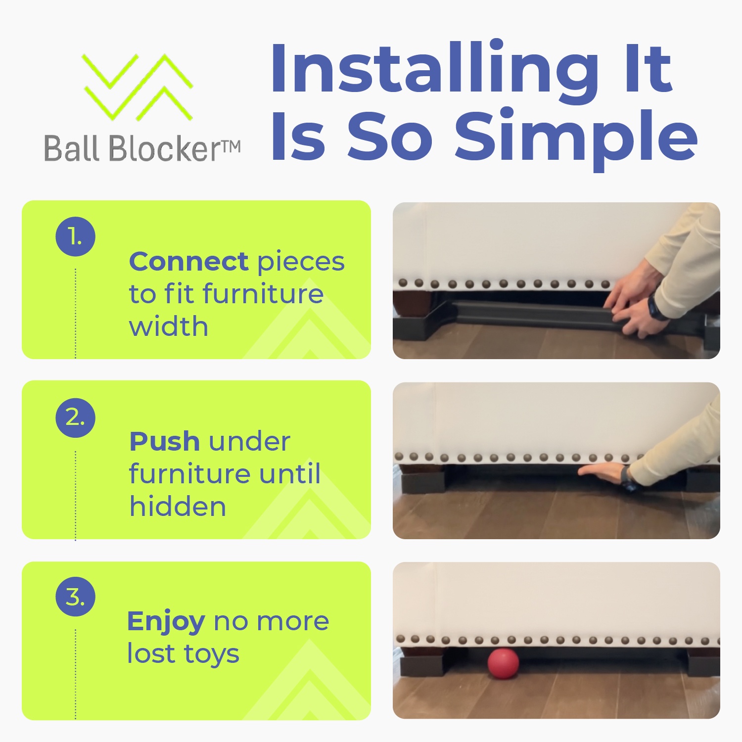 Ball Blocker is designed for easy installation without the need for tools. Simply adjust the length using the attached Velcro, slide under your furniture, and walk away. No tape, no cutting, no mess.